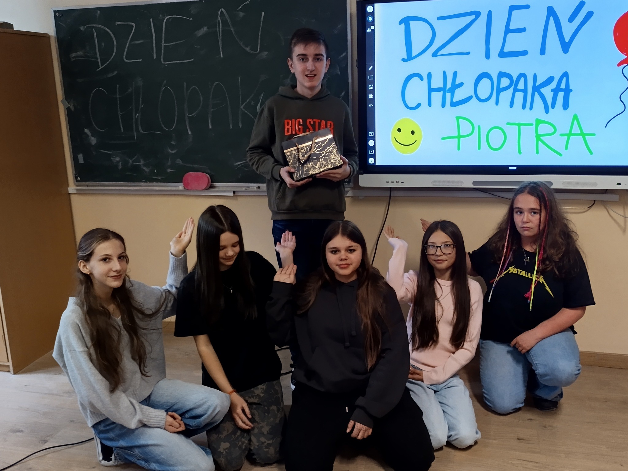 Dzień Chłopaka w klasie VIII to coroczna tradycja, podczas której dziewczęta składają wyjątkowe życzenia i wręczają symboliczny prezent swojemu koledze z klasy – Piotrowi.